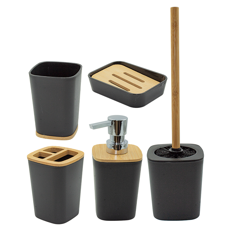 KIT BANHEIRO 24,5X19CM C/6PCS QUAD CESTO DE LIXO/ESCOVA DE BANHEIRO/DISPENSER/SABONETEIRA/PORTA ESCOVA/COPO BAMBU LISO C
